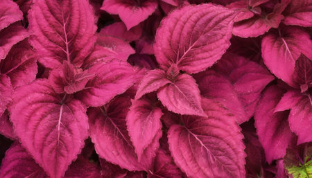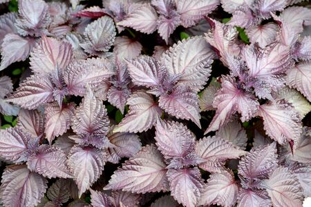 Beautiful background of Shiso leaves, closeup Purple Perilla frutescens leaves. Growing fresh herbs.