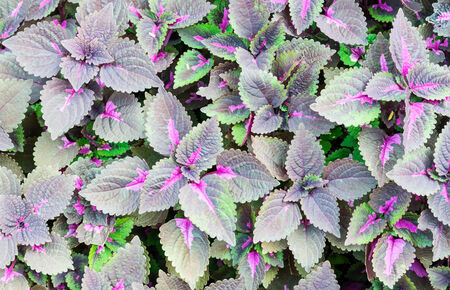 Beautiful green and purple leaves of the plant coleus Plectranthus scutellarioides and Perilla. Textured natural background made of beautiful bright leaves.