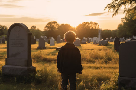 Sad little child boy standing on cemetery at sunset. Generative AI.