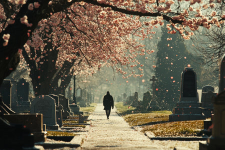 A lone figure silhouetted against a backdrop of blossoming cherry trees lining a quiet historic alley in a serene city park setting