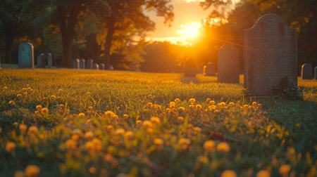 cemetery at dusk, with the sun setting over the horizon and a clear sky, created with generative ai