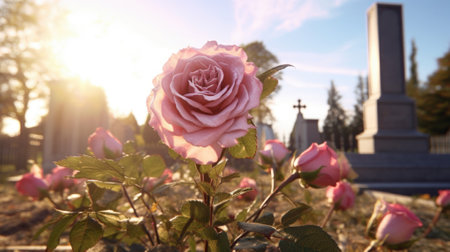 Tombstone Adorned with Red Flowers at Sunset, Evoking Themes of Remembrance and Loss.