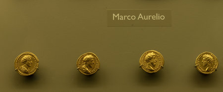 Close-up of four ancient Roman gold coins featuring Emperor Marcus Aurelius on display at the Merida Museum, Spain.