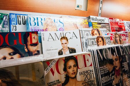 Istanbul, Turkey - May 28; 2010: Multiple international Fashion magazines as Amica, Vogue, Brides, Wallpaper, Marie Claire, InStyle for sale at press newspaper stand