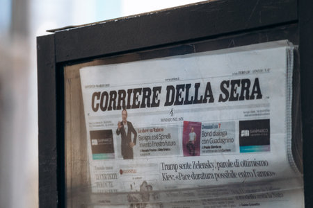 Milan, Italy - March 19, 2025: Corriere della Sera newspaper displayed at street kiosk in central Milan