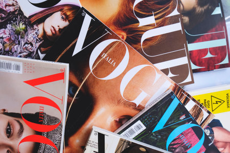 Heap of Vogue Italia fashion, beauty and lifestyle magazines. Pile of Conde Nast publications cover headlines