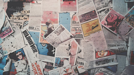 A nostalgic background featuring scraps of old, faded, and battered ads, clippings from tattered posters, and torn advertising posters pasted on a billboard, creating a vintage and rustic texture.