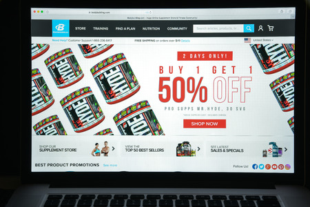Milan, Italy - August 10, 2017: Bodybuilding.com website homepage. It is an American online retailer based in Boise, specializing in dietary supplements. Bodybuilding.com logo visible.