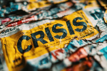 Close-up of word CRISIS printed on dirty, crumpled newspapers. Concept of media panic, economic collapse and urgent news