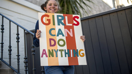 Smiling young girl holding a colorful protest sign with the message 'GIRLS CAN DO ANYTHING' on a set of stairs. Feminist empowerment and motivation concept