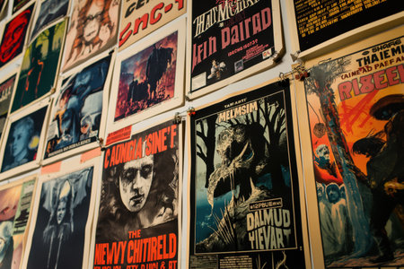 Closeup view of a wall covered with vintage horror movie posters featuring monsters and scary characters, creating a spooky and nostalgic atmosphere