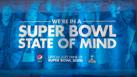 NEW YORK - JANUARY 30 Pepsi Official Soft Drink of Super Bowl XLVIII billboard on Broadway during Super Bowl XLVIII week in Manhattan on January 30, 2014 PepsiCo is a Super Bowl XLVIII sponsor