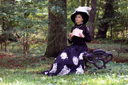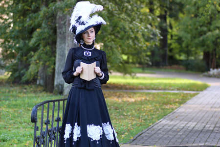 Reconstruction of the late 19th and early 20th centuries. A feminine young brunette lady in an elegant black dress and hat walks among green foliage in the park.