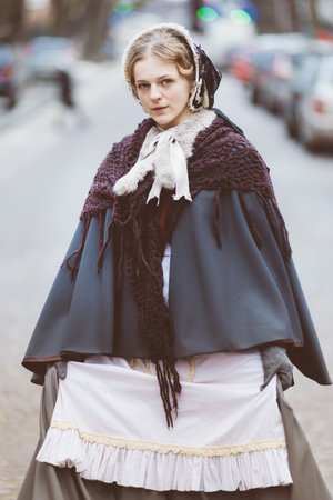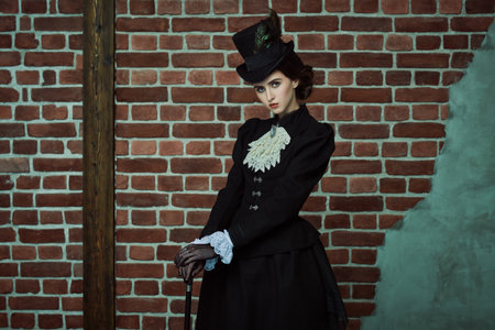Adorable young brunette lady in traditional 19th century clothes with makeup and hairstyle of victorian era. Brick wall background. Historical hairstyle and makeup.