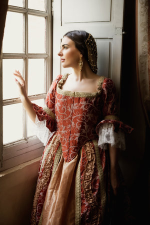 Woman wearing authentic Renaissance costome and headdress standing at her window in a medieval castle