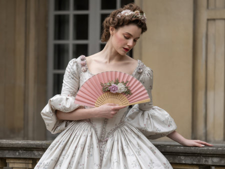 A woman in a detailed period dress with a decorative fan poses gracefully outdoors near a building.