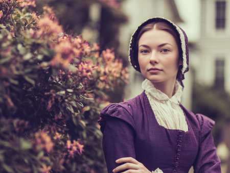 a victorian lady in a purple gown stands on a garden path with soft blossoms, combining history, femininity, and outdoor grace. ai generated.