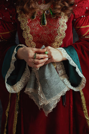 Closeup on medieval queen in red dress with dried flower on dark gray background.