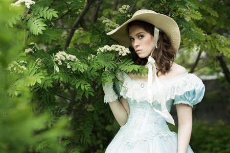 A beautiful young woman in a historical blue dress with an umbrella, gloves and a hat. Dress on a woman of the 19th century. Design for the book cover