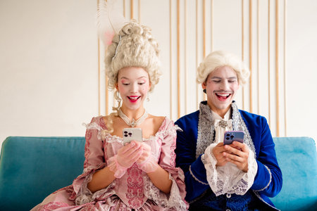 Elegant couple in baroque costumes having fun with smartphones indoors