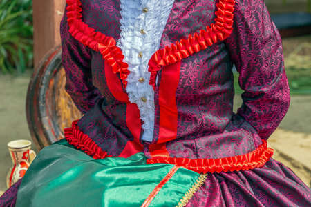 Portrait of brunette woman dressed in red historical Baroque clothes with old fashion hairstyle, outdoors. Middle class medieval dress
