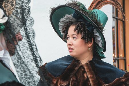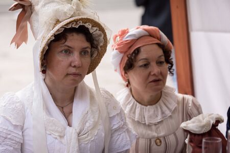 Moscow, Russia - 12 June 2019: Portraits of characters historical reconstruction in beautiful historical and authentic costumes at the festival Times and Epochs in Moscow.