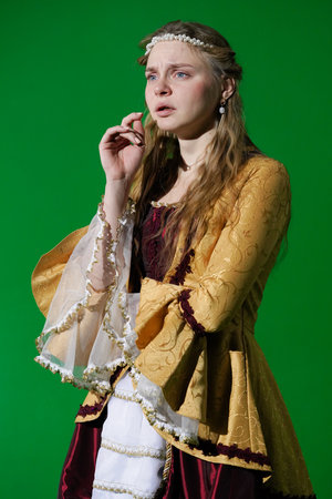 Woman in ancient outfit on chroma key green screen background. Female in renaissance dress looking away with concentrated face and open mouth, thinking.