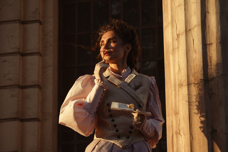 Portrait of a woman in vintage clothing, illuminated by warm sunlight, against a backdrop of ancient architecture.