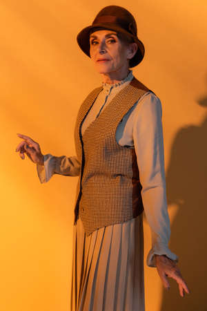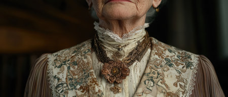 Elegant mature woman wearing vintage jewelry and patterned dress.