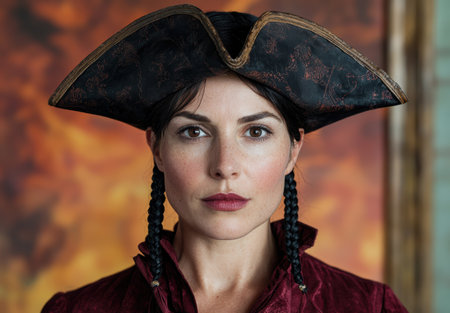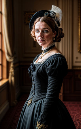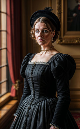 A striking portrait of a woman in a vintage black dress with a lace collar, set against an ornate background, exuding elegance and confidence.