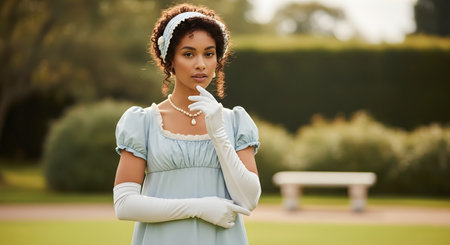 A beautiful young woman with curly hair, dressed in a light blue Regency-era empire-waist dress, white gloves, and a headband. She is standing in a formal garden, looking at the camera with a thoughtful expression, her hand to her chin. This image is reminiscent of historical costume dramas.