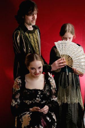 regal Elizabethan woman adorned in intricately embroidered gown Her dramatic expression conveys intrigue while holding delicate silk handkerchief