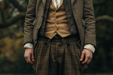 Close-up view of an antique outfit showcasing fabric textures and buttons. The tones are soft and muted, emphasizing the details of the clothing.