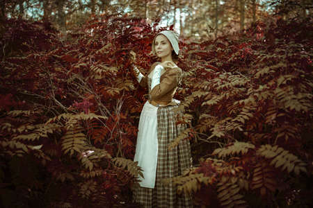 A lovely Scottish girl in an 18th century costume stands in the summer woods among the bushes. Fairy tale girl of the 18th century. Scottish girl.