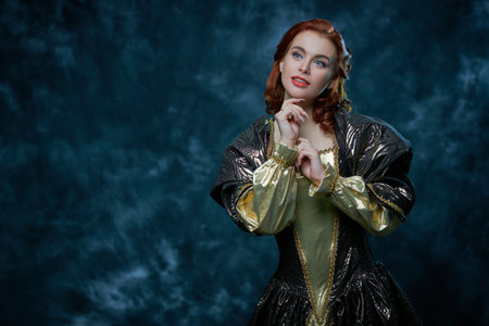 Beautiful woman in renaissance dress on abstract dark background, studio shot