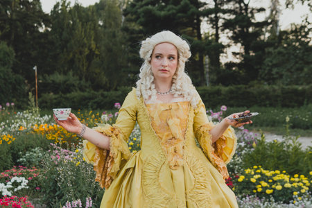Portrait of blonde woman dressed in historical Baroque clothes with old fashion hairstyle, outdoors. Luxurious medieval dress