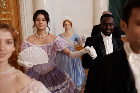 Diverse group of ladies and gentlemen enjoying dance ball in palace and walking holding hands in line