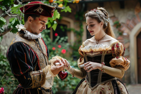 A young man in a Renaissance costume presents a heart-shaped object to a woman in an elegant gown. They are surrounded by blooming flowers in a picturesque garden.