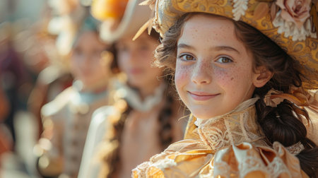 A young girl in a beautiful golden dress is smiling at the camera. She is wearing a fancy hat and has her hair in ringlets. The background is blurry and there are people in the distance.