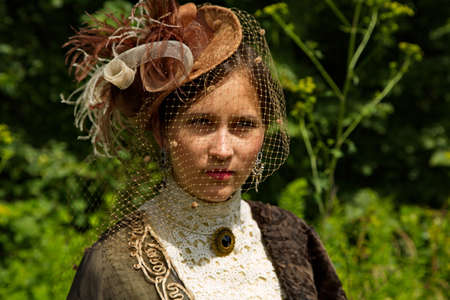 Historical reconstruction. Portrait of an elegant lady in a 19th century suit and hat posing at the railway station. Historical fashion and hairstyle. Steampunk lady.