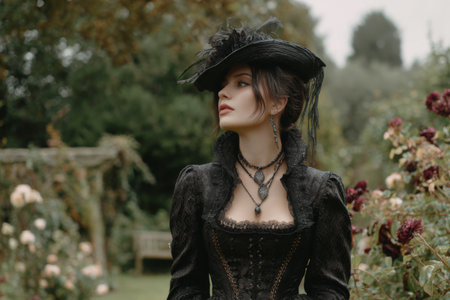 A woman dressed in a stunning black vintage gown stands gracefully in a garden filled with blooming roses. The atmosphere is serene and slightly moody, typical of an overcast afternoon.
