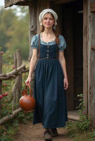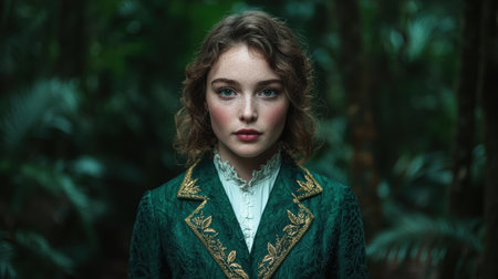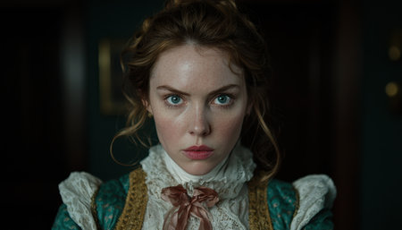 Soft light highlights a young woman dressed in period attire, with delicate fabrics framing her gentle features. She exudes a serene and timeless beauty.