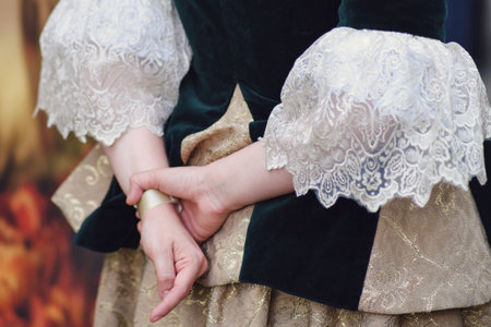 Women's arms crossed behind their backs in retro clothes. Old objects of the 18th century era, reenactment of events