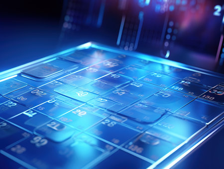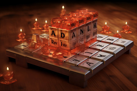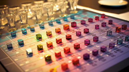 A dynamic, 3D rendering of the periodic table of elements, presented as a vibrant grid of colorful, glowing tiles.