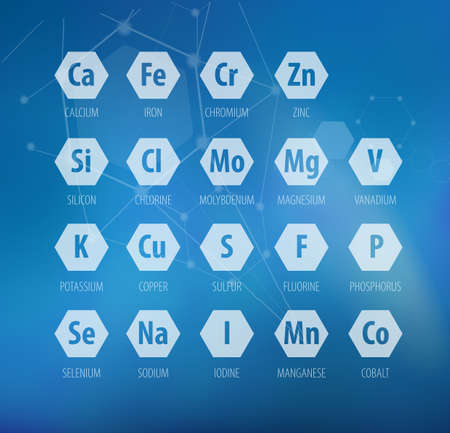 Minerals for human health. Schematic scientific image of the short and full name of micro elements.
