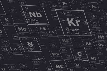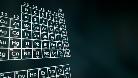 Background in perspective of the chemical elements of the periodic table, atomic number, atomic weight, name and symbol of the element on a black background
