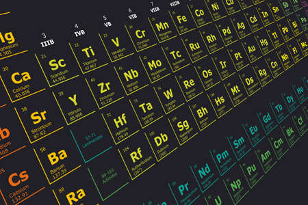 Colorful futuristic background in perspective of the periodic table of chemical elements with their atomic number, atomic weight, element name and symbol on a black background