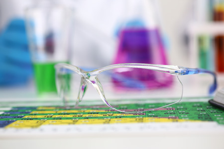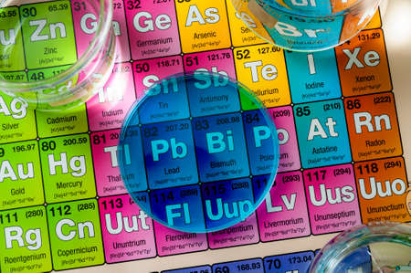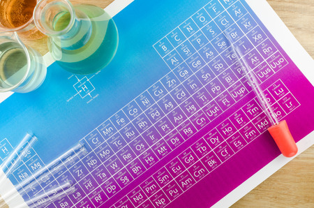 Chemical reaction and scientific experiment concept with close up of set of test tubes, chemistry glassware, flask and a petri dish with blue liquid on the periodic table