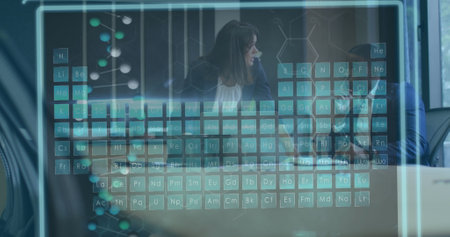 Image of network of connections over mendeleevs table. science and research concept digitally generated image.