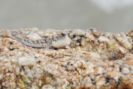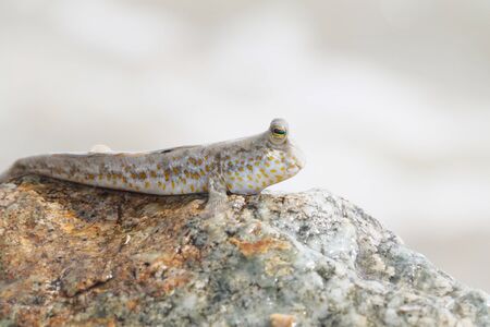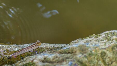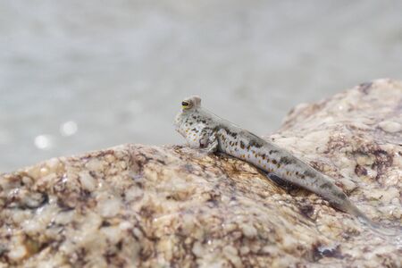 Mudskipper fish out of the sea and resting on a wet rock close-up shot.